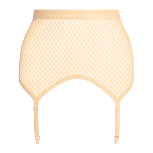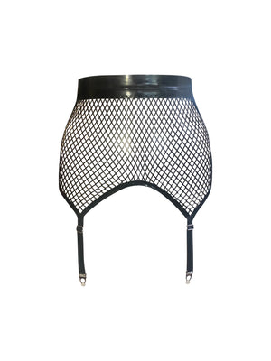 Sitting high-waisted, our garter skirt is laser-cut in a fishnet pattern.