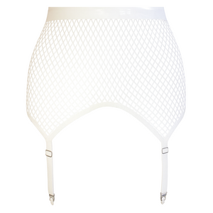 Sitting high-waisted, our garter skirt is laser-cut in a fishnet pattern.