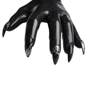 These one-of-a-kind, medium-sized gloves feature black stiletto-shaped nails adorned with intricate silver spider web designs, making them a true collector’s piece.