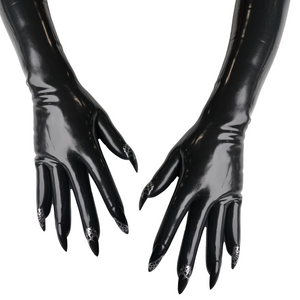 Step into high drama with our Opera Length Lucifer Gloves, elevated with custom stiletto nails crafted by a Long Beach artisan. This striking edition blends the sleek elegance of opera-length latex gloves with the dark, gothic flair of hand-detailed nails.