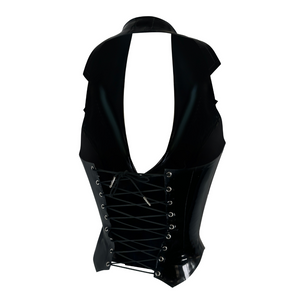 This adorable halter vest features a snap-front design that’s sure to turn heads. Made from premium .45mm latex imported from England, it lovingly shapes your silhouette. With a flirty halter neckline and adjustable lace-up back, this vest lets you customize your fit while bringing out your bold, seductive side. Perfect for a night full of excitement and eye-catching style!