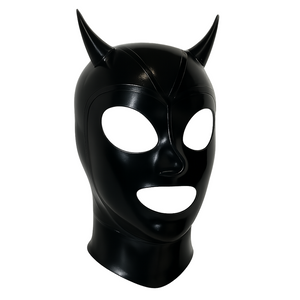 Choose from either a cat-eye cut (for a dramatic, feline-inspired look) or a soft oval-eye cut (for a streamlined, versatile finish). A back zipper ensures a snug fit and flawless polish, while the pointed latex horns give the hood an instantly devilish attitude.
