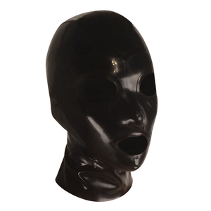 Latex hood with customizable eye cutouts: cat-eye or oval-eye