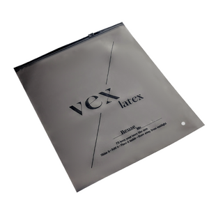 Protect your latex garment in one of our custom dark gray frosted storage bags.