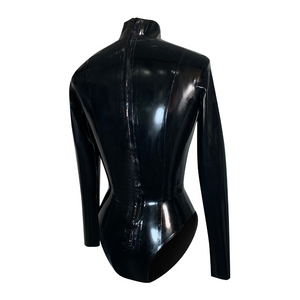 The simple bodysuit has a classic silhouette with long sleeves, a mock turtleneck and and a higher cut leg than our blaire bodysuit.