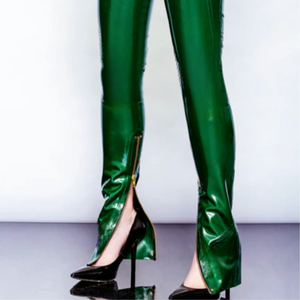 Our exclusive moto jeans feature zippers on the rear pockets and ankles. Expertly handcrafted in our California studio with premium .50mm latex imported from England. This particular style was originally launched on Bravo's Styled to Rock alongside Rihanna and was created by our own designer, Laura, who placed second in the design competition. Equipped with a pull-on design, these jeans are the perfect addition to any wardrobe.