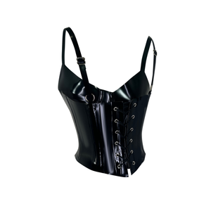 A sexy bustier with underwire bust, laced back for easy adjustment. Adjustable straps. .45mm and 1.00mm latex imported from England. Experience the ultimate in luxury and comfort with Nikki Bustie. Our expertly crafted bustier features underwire support and a laced back for effortless adjustment. The adjustable straps ensure a perfect fit, while the high-quality .45mm and 1.00mm latex imported from England adds a touch of European elegance to your wardrobe. Feel confident, sexy, and supported all day long with Nikki Bustie.