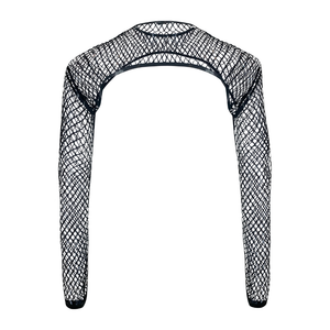 Laser cut fishnet latex in a short unisex bolero jacket. Make a bold statement with Solar Bolero's unisex jacket. The laser cut fishnet latex design adds a touch of daring to any outfit. Stay ahead of the curve and bring the energy of adventure to your wardrobe.