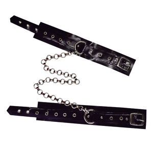 Our Bond Ankle Cuffs is a sleek latex cuff set featuring bold silver hardware and a option chain sold separately. Whether you're layering it over a look or indulging in play, these cuffs balance function and fetish in true Vex fashion. Each cuff is hand-cut and finished to perfection.