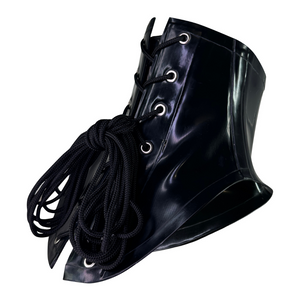 A sculptural force. The Torque Collar is a high-shine latex neck corset reinforced with internal steel boning for dramatic structure and neck support. This piece frames the jawline and shoulders with an architectural flare, creating a silhouette that’s both regal and commanding.